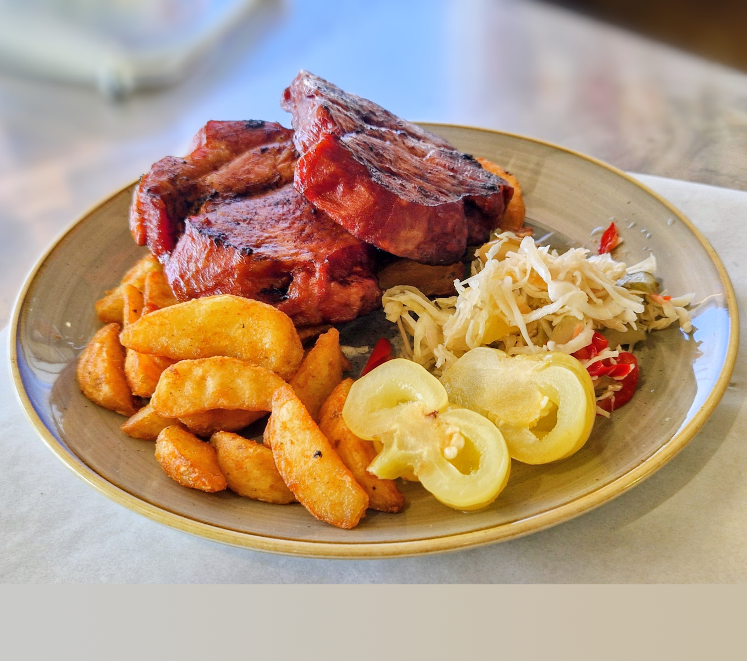 Legalább 25 dkg jól átsült, omlós ízes tarja. Kívül ropogós, belül szaftos – pontosan úgy, ahogy kell. Steakburgonyával és savanyúsággal tálalva, hogy teljes legyen az élmény.